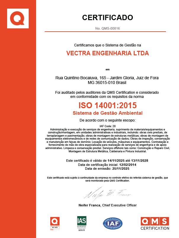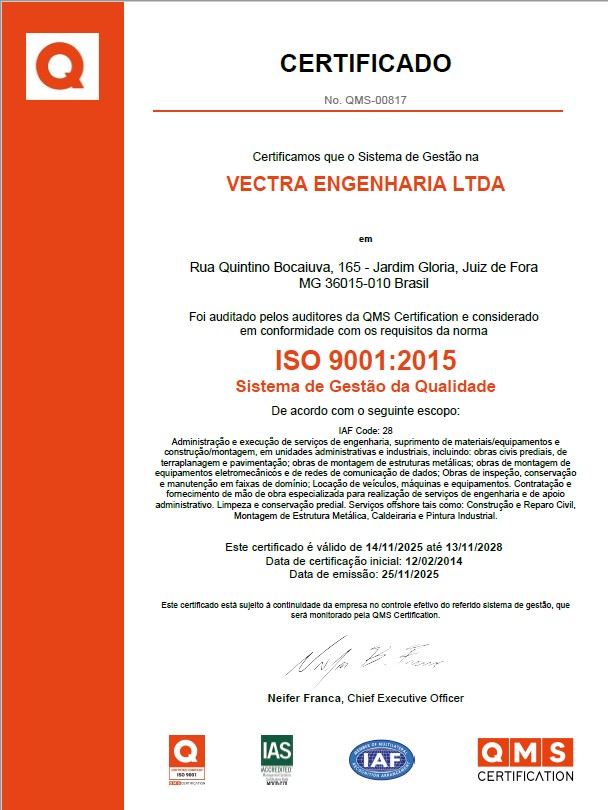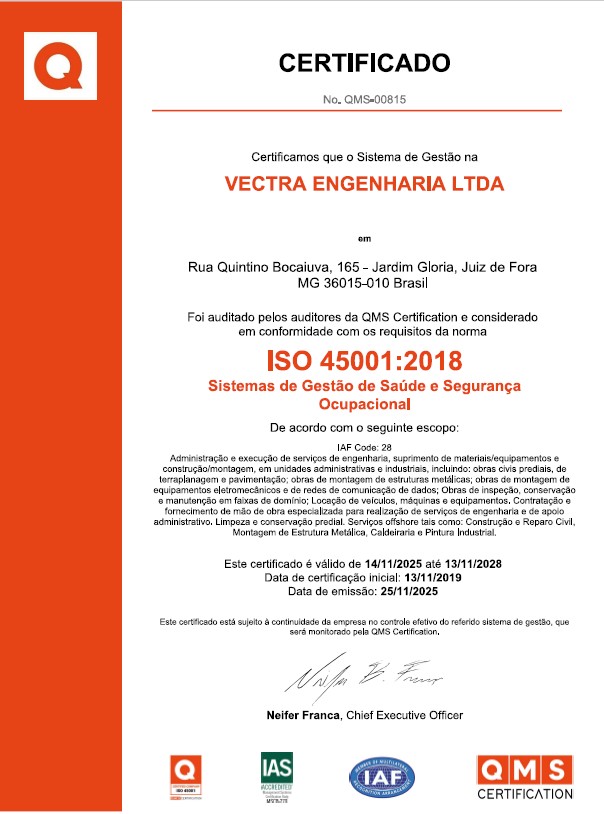 A VECTRA ENGENHARIA possui um Sistema de Gestão, certificado desde janeiro de 2014, nas normas de referência ISO 9001, ISO 14001 e ISO 45001. Seu modelo de gestão contempla, ainda, as práticas de Gerenciamento de Projetos, baseado no conjunto de conhecimento do PMBoK (Project Manager of Body of Knowledge).